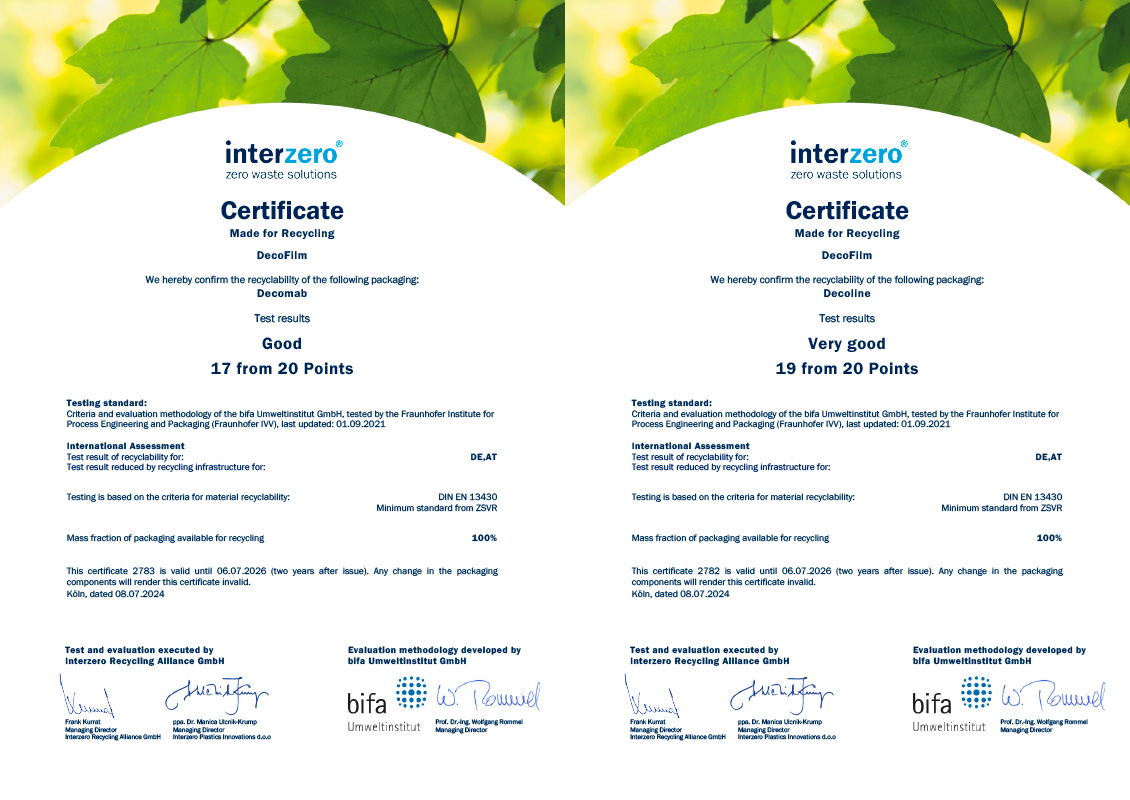 Decofilm Group recently obtained Interzero's “Made for Recycling” certification for the #Decoline and #Decomab lines, with outstanding results: